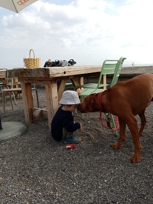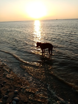 Zoa enjoys a romp on the beach at Dunbar, that in spite of the hooley.